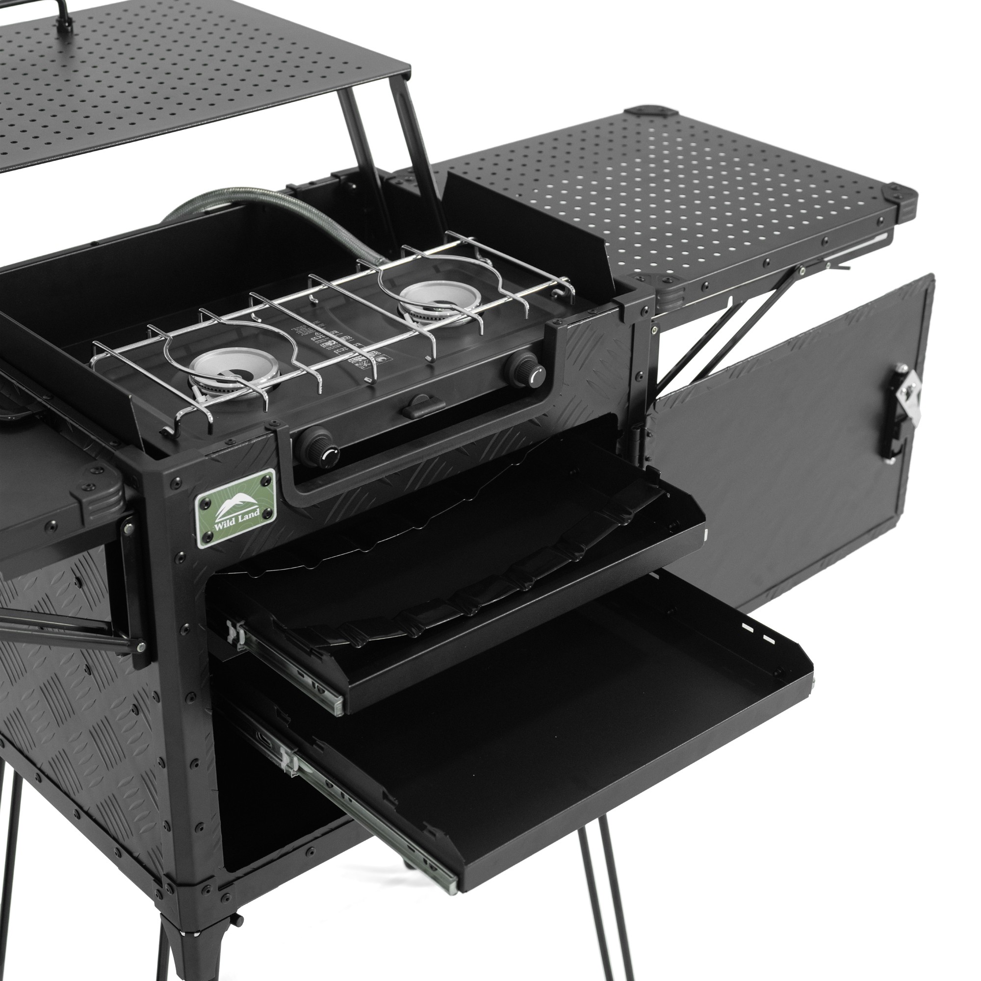 Bila para pekemah menginginkan kemudahan dan ruang untuk rencana memasak di luar ruangan, Wild Land Compact Integrated Stove & Kitchen dapat memenuhi kebutuhan tersebut dengan pusat kendali aluminiumnya yang meliputi kompor, talenan, wastafel, laci penyimpanan geser, dan rak yang dapat diangkat, yang semuanya dapat dilipat menjadi satu wadah kompak yang sempurna untuk penyimpanan.